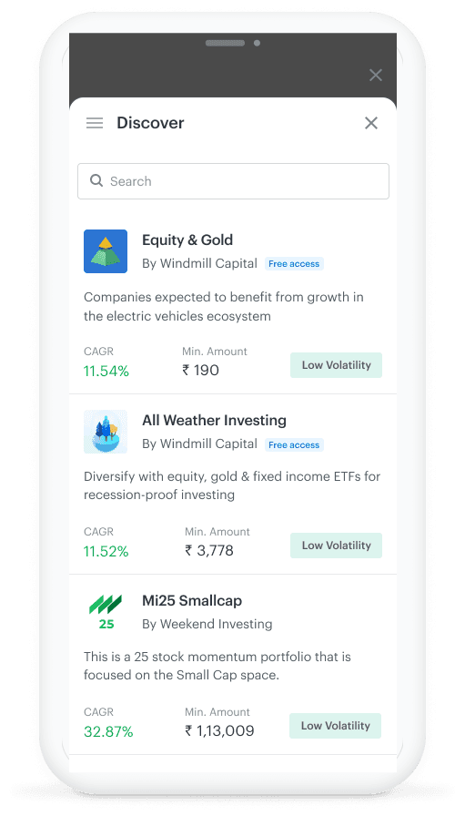 A dedicated discover screen to help the user explore smallcases by different categories. This screen includes: